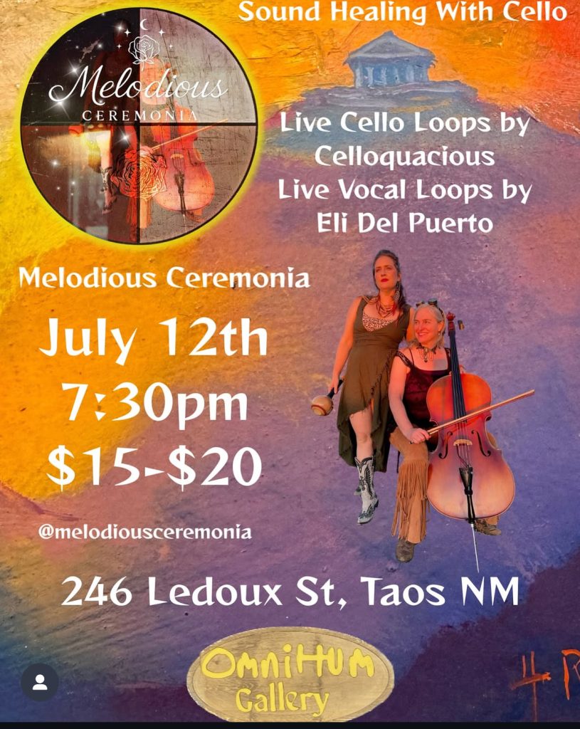 Join us for a transformative evening as Melodious Ceremonia takes the stage, an immersive concert where performance becomes ritual and sound becomes medicine. Rooted in classical traditions and elevated through experimental electronics, looping cello, world rhythms, and layered vocals, the duo creates a powerful soundscape designed to awaken, ground, and inspire.