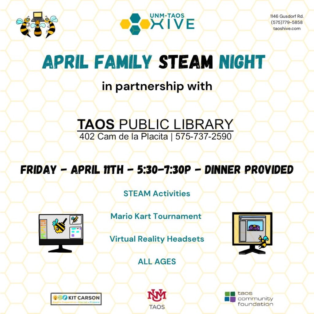 April Family Night – STEAM April 11, 2025 This event is over 6 months old, but I bet there is something great happening somewhere! View Current Taos Events! < Back to Events