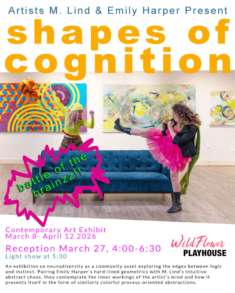 An exhibition on neurodiversity as a community asset exploring the edges between logic and instinct. Pairing Emily Harper’s hard-lined geometrics with M. Lind’s abstract chaos, they contemplate the inner workings of the artist’s mind and how it presents itself in the form of similarly colorful process-oriented abstractions.