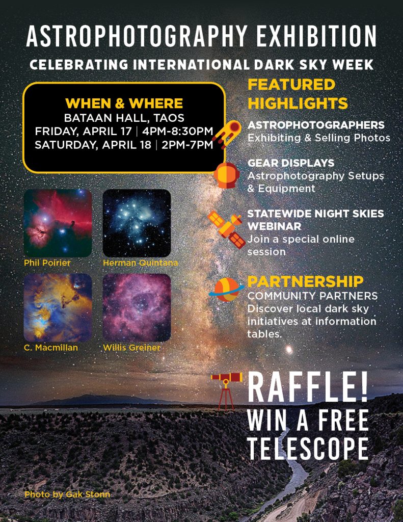 In celebration of International Dark Sky Week, join us for a free Astrophotography Exhibition showcasing stunning night‑sky imagery and the tools used to capture it. The event features an exhibit and sale of astrophotography, hands‑on displays of astrophotography equipment, and information on local and statewide dark sky initiatives. Attendees can also participate in a statewide night sky webinar and enter a raffle for a chance to win a free telescope.