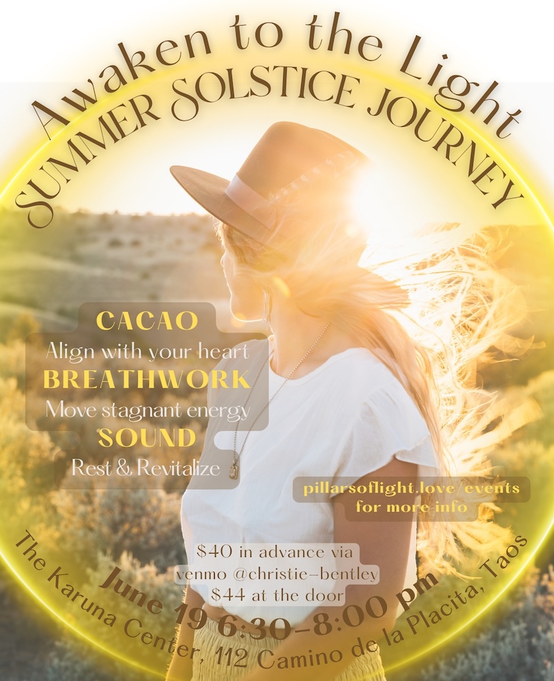 Join Christie at the gorgeous, historic Karuna Center in downtown Taos for an evening of prayer and energetic cleansing as we welcome the Summer Solstice.