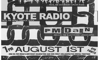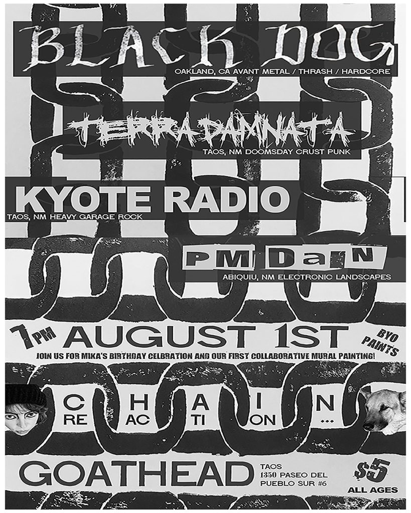 Come out August 1st for music, collaborative mural painting and birthday celebrations! Our buddies BLACK DOG are coming together to blow Taos away with locals TERRA DAMNATA and KYOTE RADIO and P.M. DAIN from Abiquiu. This one’s going to be 🔥 🔥 🔥