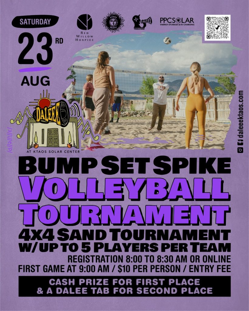 Join us Saturday, August 23rd at DALEEE KTAOS for the Bump Set Spike Volleyball Tournament! Itâs a 4×4 sand showdown with up to 5 players per team, running from the morning serves to the final evening spike.