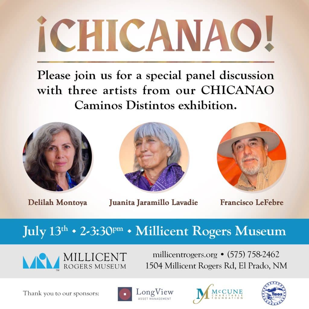 Please join us for an artist panel with three artists from our CHICANAO Caminos Distintos exhibition, Juanita Jaramillo Lavadie, Francisco LeFebre, and Delilah Montoya.