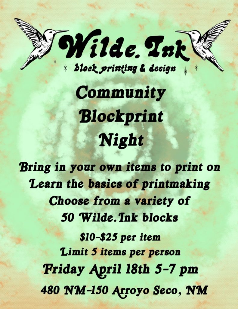 Community Print Night April 18, 2025 This event is over 6 months old, but I bet there is something great happening somewhere! View Current Taos Events! < Back to Events