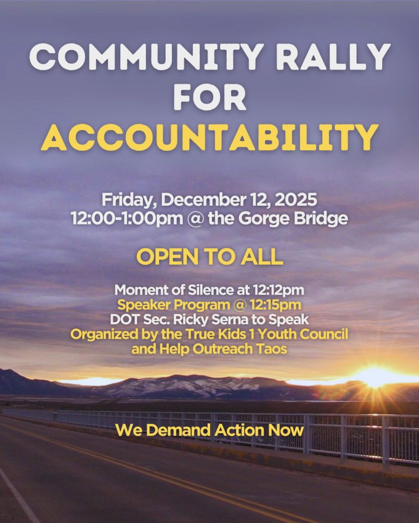 Kids 1 and Help Outreach Taos will convene another rally at the Gorge Bridge. On December 12,