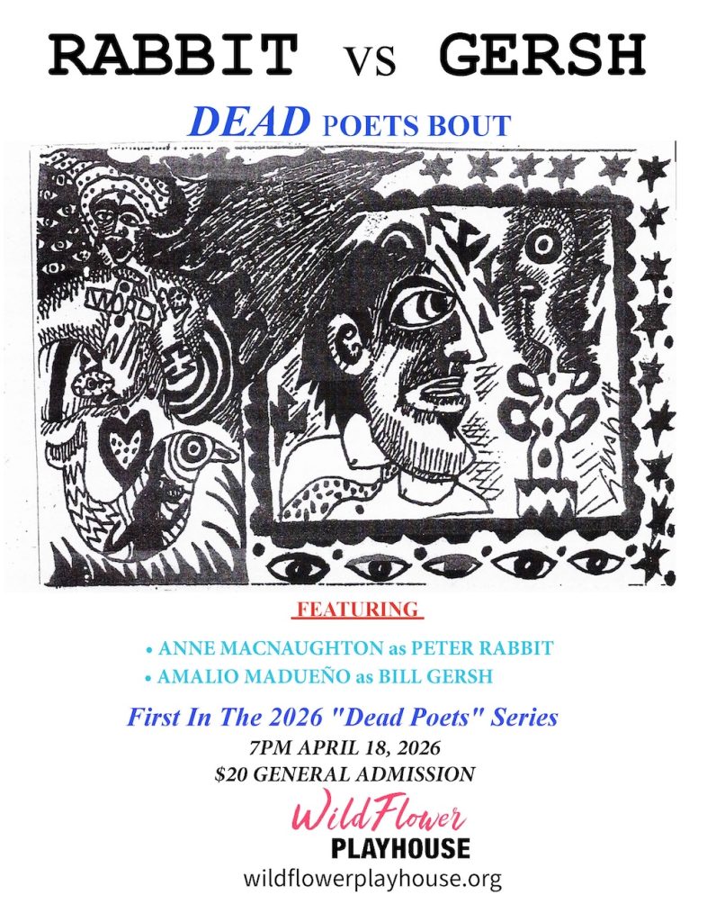 Poetry of famously deceased Taos poets Bill Gersh (1943-1994) & Peter Rabbit (1936-2012) will be performed in an 8-round “DEAD POETS’ POETRY BOUT PERFORMANCE at WILDFLOWER THEATRE, in Taos. at 7pm on APRIL 18, 2026. Part of the TAOSPOETIX! Poetry series, Taos poets Anne MacNaughton & Amalio Madueño will read from works of Gersh & Rabbit in the competitive “poetry bout’ boxing-match format (featuring a referee, judges & ring girls) made famous by the Taos Poetry Circus over a 20-year period from 1982 to 2002. The performance reprises events originating with the annual 1982 Poetry Circus with Allen Ginsberg, covered by AP & the New York Times. Numerous poetry bouts over the years included many NM poetry luminaries as well as nationally recognized poets.