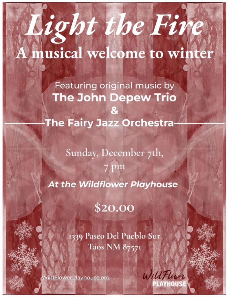 Light the Fire: A Musical Welcome to Winter presents an evening of music to warm the heart and invite the soul in anticipation of colder, darker times. Celebrating the inspirational side of winter—realized in the musician’s retreat to the composing process and the practice room on dark winter nights—we feature original music by the John Depew Trio and the Fairy Jazz Orchestra in hopes of bringing the audience a new listening experience, which is also the aim of holding our concert in the welcoming theatrical space of the Wildflower Playhouse.