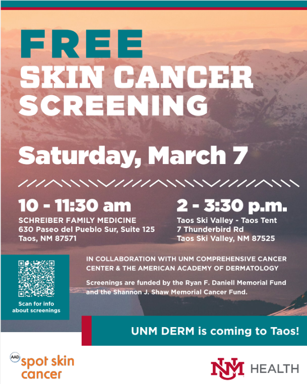 IN COLLABORATION WITH UNM COMPREHENSIVE CANCER CENTER & THE AMERICAN ACADEMY OF DERMATOLOGY. Screenings are funded by the Ryan F. Daniell Memorial Fund and the Shannon J. Shaw Memorial Cancer Fund.
