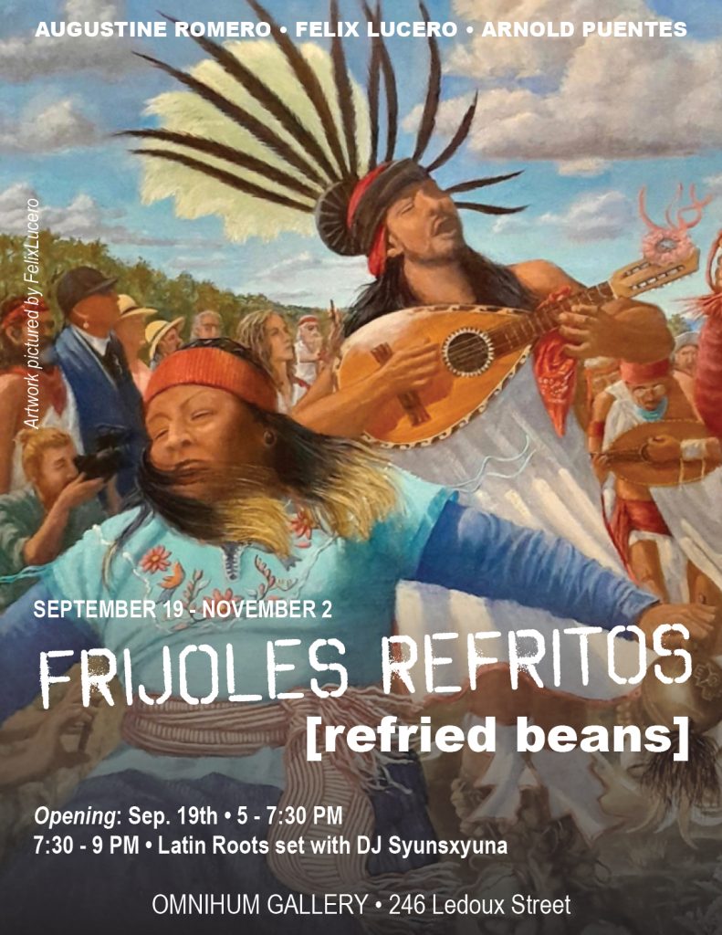 The exhibition features Felix Lucero, Arnold Puentes, and Augustine Romero, artists rooted in Mexicano, Chicano, and Americano traditions who reawaken and rejuvenate cultural expression with a blend of styles that is—like good refried beans—superior to the original. In this gallery of hot lard (manteca), the three artists serve up distinct yet harmonious works, proving there are no has-beans here.