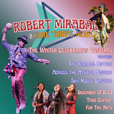 For nearly three decades Robert Mirabal has been sharing his music and spirit as part of his annual winter celebration concerts. Taos Pueblo’s native son returns to Taos Center for the Arts on December 12 and 13 to once again present this acclaimed holiday tradition. Join Robert, his band Rare Tribal Mob and guests for this special celebratory night of song, story and dance focused on respect for family, culture, heritage and the land.