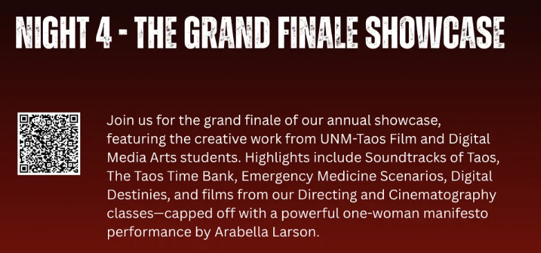 Our apex annual event, this event will showcase the creative work from our fall classes. Intro to Digital Media Arts will present “Soundtracks of Taos,” followed by “The Taos Time Bank” and ‘Emergency Medicine Scenarios” from Video Production, “Digital Destinies,” from the Digital Illustration class, and three films from our Directing and Cinematography classes.
