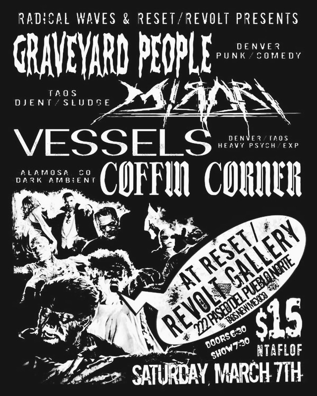 Radical Waves Showcase featuring Graveyard People (Denver CO) ,Vessels (Taos/DEN), Mirari (Taos NM), Coffin Corner (Alamosa CO) – An evening of comedy laced punk ,