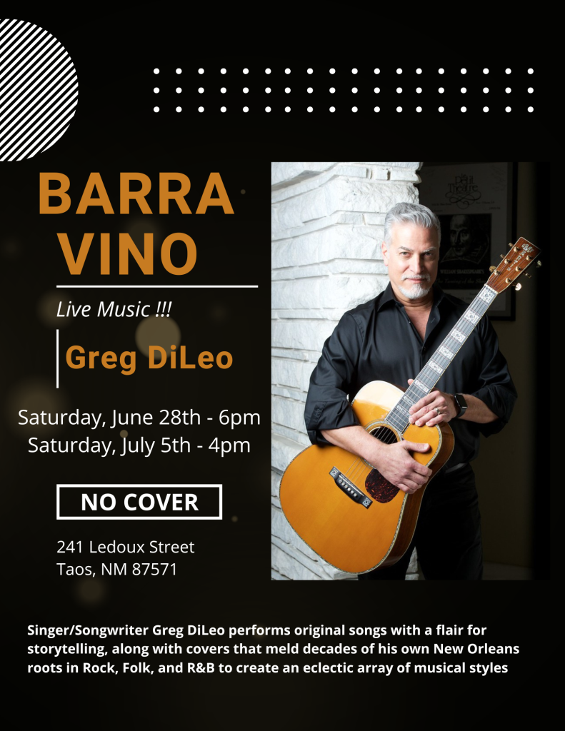 Original and cover songs by Taos Singer/Songwriter, Greg DiLeo. Original songs with a flair for storytelling, inspired by his New Orleans roots.