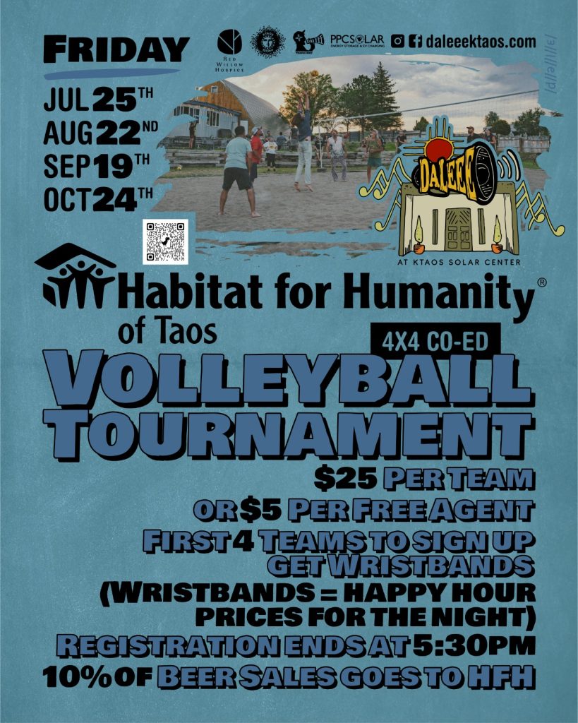 Get ready to bump, set, and spike for a cause at DALEEE KTAOS’s monthly 4×4 Co-Ed Volleyball Tournament, benefitting Habitat for Humanity of Taos — Friday, July 25th at 6 PM!