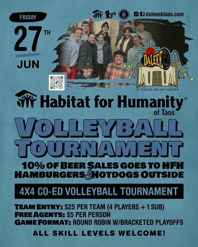 đ Join us Friday, June 27 at 5 PM at DALEEE for a 4×4 Co-Ed Volleyball Tournament benefiting Habitat for Humanity of Taos! đ