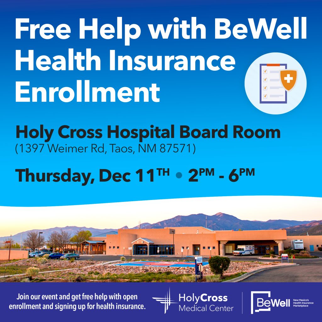 Holy Cross Hospital in Taos will host a free open-enrollment assistance event on December 11th from 2 to 6 p.m. Designed to help community members navigate their health care options, the session offers confidential, one-on-one support through the Holy Cross Benefit Navigation Program. Attendees can receive guidance on BeWell Health Exchange eligibility, get help submitting applications, and have their insurance questions answered. The event is open to anyone seeking support during the enrollment period, and additional assistance is available year-round through the Benefit Navigation team.