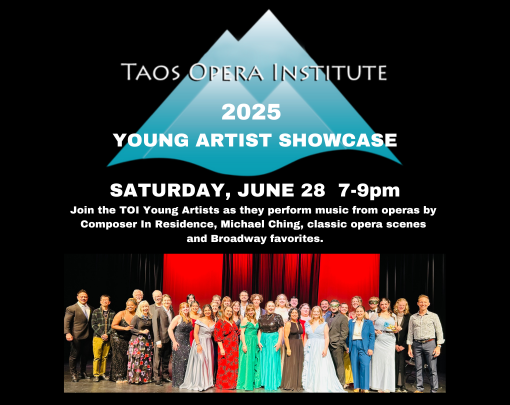 Taos Opera Institute celebrates their 17th Annual Showcase Performance on Saturday, June 28 at 7pm. Twenty-eight college-aged Young Artists from around the country will perform music from operas written by TOI’s Composer In Residence, Michael Ching, who will accompany them on piano. The second half of the program will feature scenes from classic operas and Broadway musicals performed by the Young Artists and TOI Faculty pianists.
