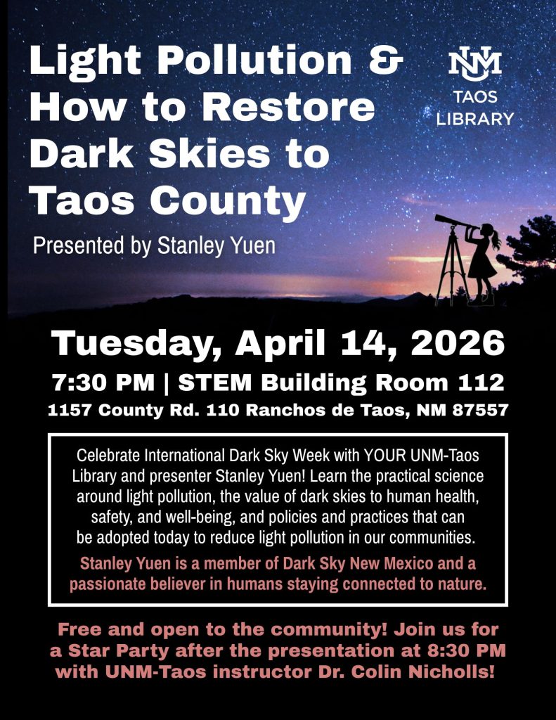 Celebrate International Dark Sky Week with YOUR UNM-Taos Library and presenter Stanley Yuen! Learn the practical science around light pollution, the value of dark skies to human health, safety, and well-being, and policies and practices that can be adopted today to reduce light pollution in our communities. Stanley Yuen is a member of Dark Sky New Mexico and a passionate believer in humans staying connected to nature.