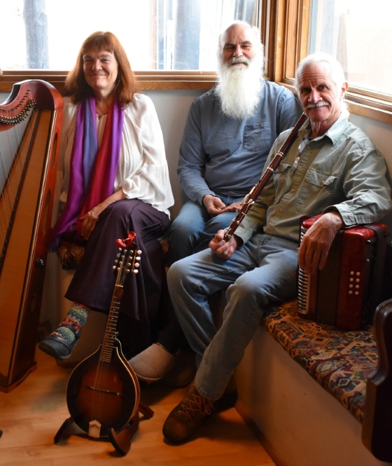 Anam Cara is a Taos-based trio that plays Celtic, folk, and original music, including meditative and soulful airs, lively jigs and reels, and spirited vocals. Anam Cara features Julie Hawley on harp and lead vocals; Chris Knox on flutes, whistles, guitar, and accordion; Jimmie Killingsworth on mandolins and guitar; and Stephen Welter on stand-up bass.