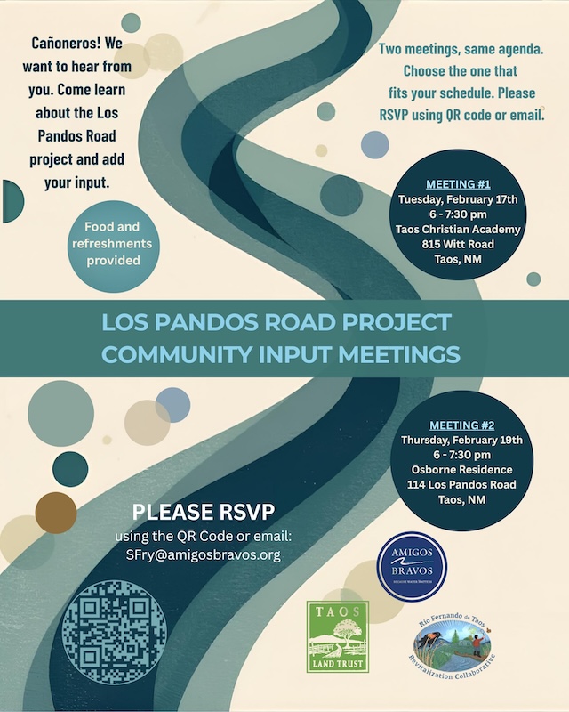 Learn about potential restoration opportunities for Los Pandos Road and the Rio Fernando. A short presentation will be made and an opportunity for the Taos Community to share their feedback and desires for our namesake river and a community road that needs public safety improvements. Food & Drink will be provided.