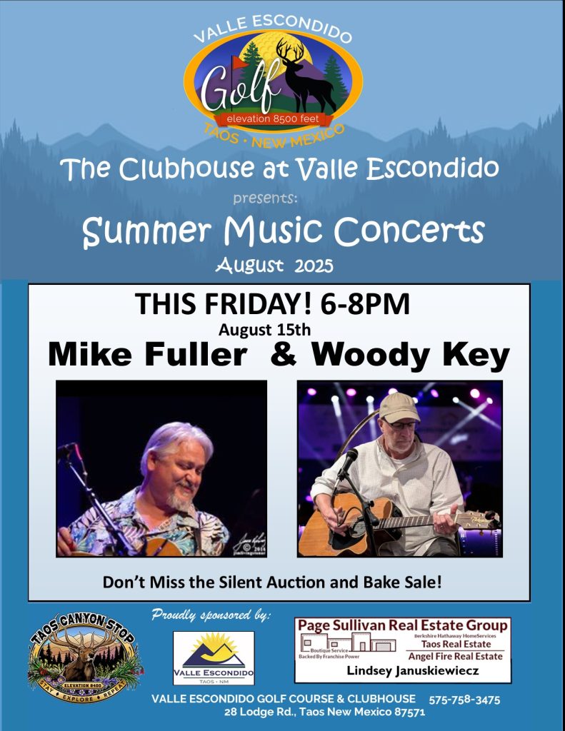 Join us in beautiful Valle Escondido for this great duo. Mike is known for his “buttery smooth” voice and Woody is one of the best guitar slingers around. No cover, full bar and great food. Silent auction and bake sale benefitting our local volunteer fire department.