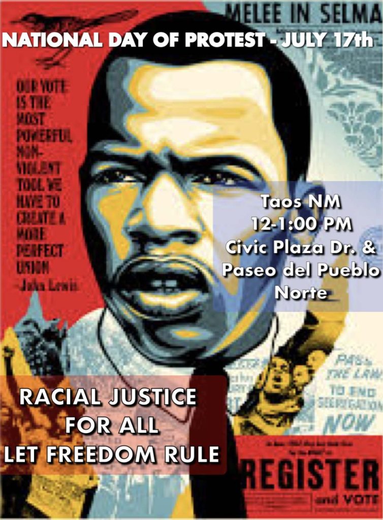 Taos joins a National Day of Peaceful Protest in remembrance of John Lewis, who passed away five years on this date. Make GOOD TROUBLE! Bring yourself, a friend, sign, water, YOUR VOICE!