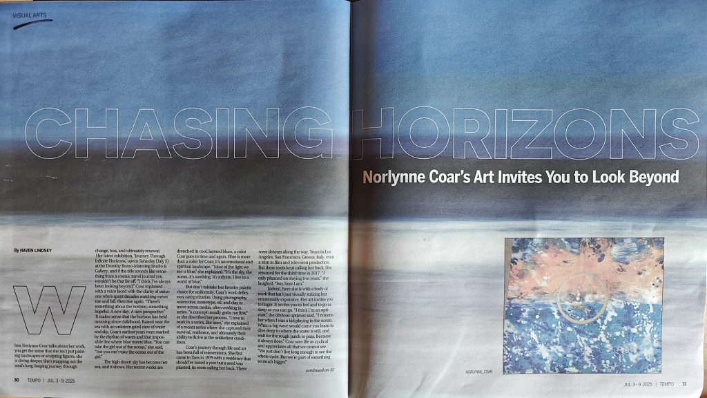 Working across media – photography, watercolor, monotype, oil, and clay sculpture — Coar defies categorization. Her work often unfolds in series, each piece sparking the next—sometimes shifting media, sometimes shifting worlds. Her art lives in the liminal space between the recognizable and the abstract, the tangible and the transcendent. At once infinite landscape and infinite space, her pieces invite viewers to go beyond the image—to feel, to experience, to remember.