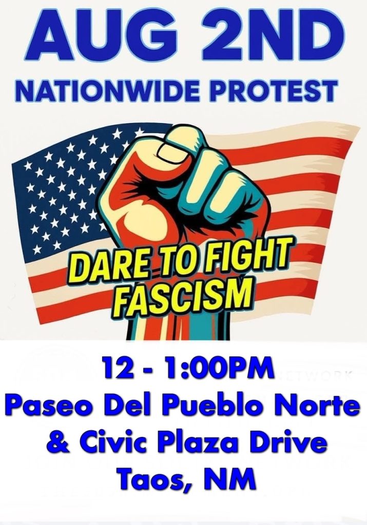 Nationwide Protest Against Fascism on August 2nd from noon -1:00 on the corner of Paseo del Pueblo Norte and Civic Plaza Drive. Bring your friends and your signs, noisemakers and voices. ADA accessible. Free parking nearby.