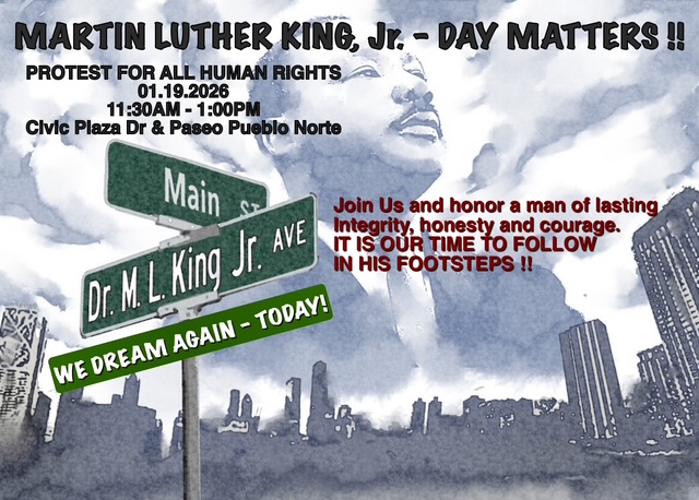 Protest for all human rights! Martin Luther King Day matters! Object to more funding for ICE! Join our peaceful gathering Monday, January 19 from 11:30-1:00 at Civic Plaza Drive and Paseo del Pueblo Norte. Sponsored by Taos United/Indivisible.