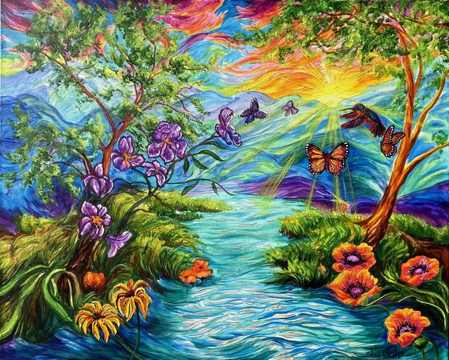 Art Opening featuring 3D paintings by Shari Ubechel celebrating spring in Taos and Mother’s Day.