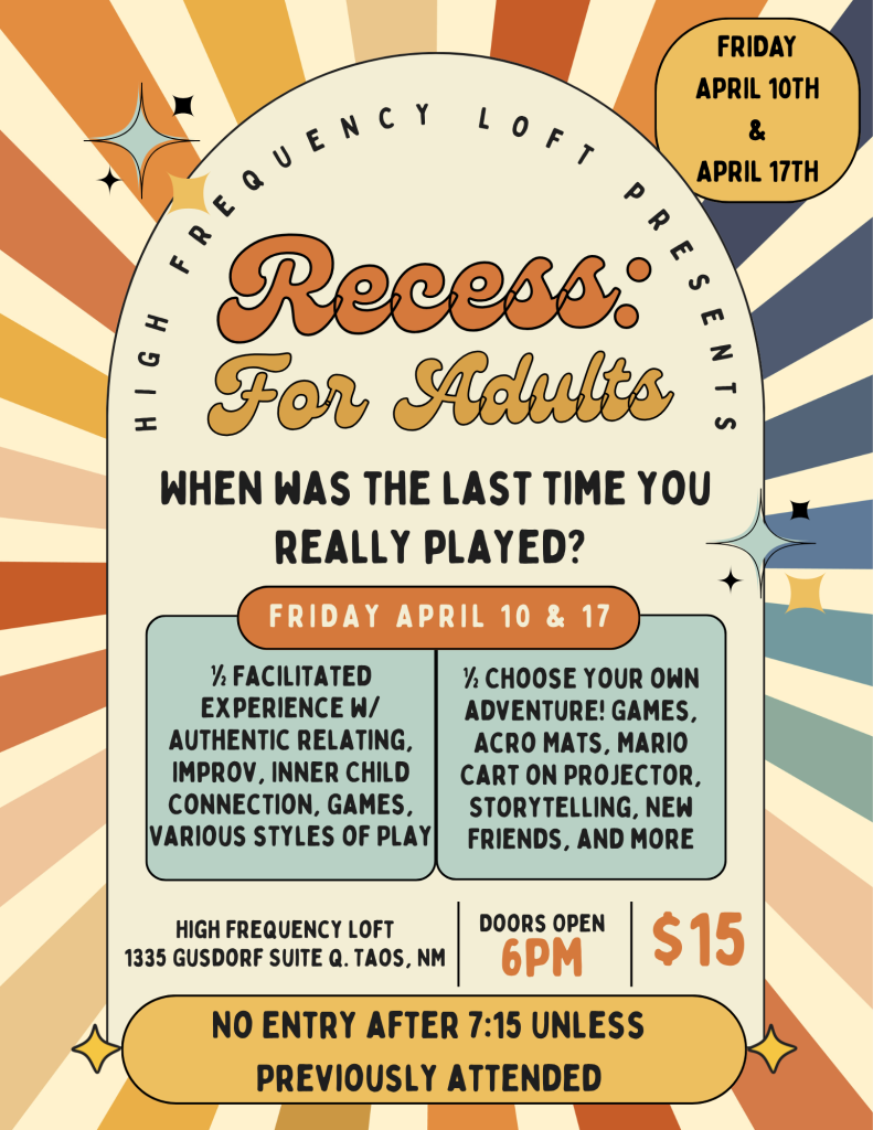 This is an intentional space for adults to do what used to be the most natural and all consuming thing in the world for each and every one of us…PLAY! Who knows, you might even make a new friend! There is no “right” way to play and together with each of the attendees we create the event!