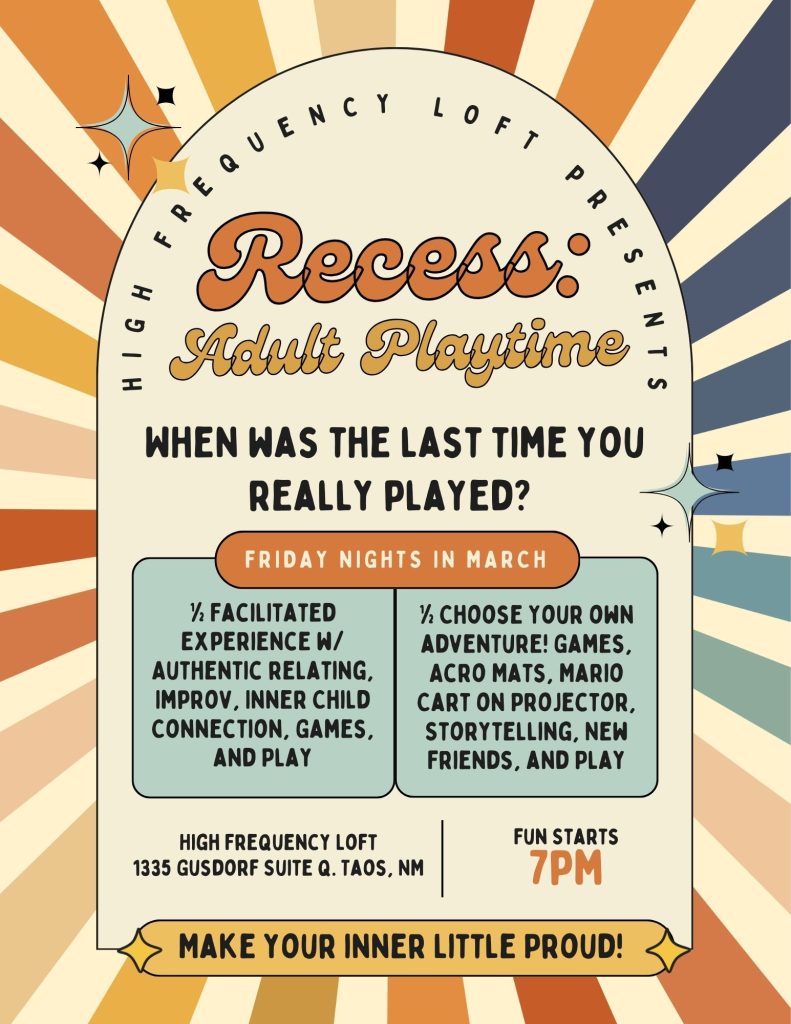 For these and a million reasons more, I created RECESS! This is an intentional space for adults to do what used to be the most natural and all consuming thing in the world for each and every one of us…PLAY! Who knows, you might even make a new friend! There is no “right” way to play and together with each of the attendees we create the event!