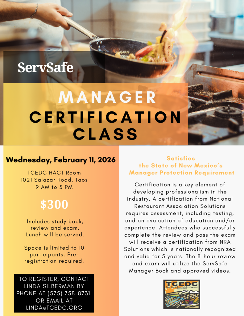 TCEDC is hosting a ServSafe Manager Certification Class on Wednesday, February 11, from 9 AM to 5 PM.