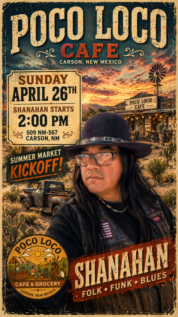 Shanahan’s set begins at 2:00 PM but come early, check out other music performances, explore local goods, support regional artists, and settle in for an afternoon of live music and community in Carson, New Mexico.