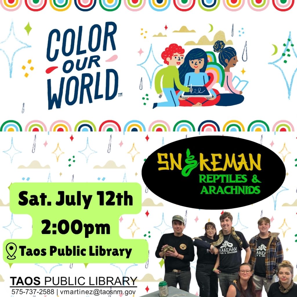 2:00pm Snakeman- Join us art the Library for a reptile and arachnid demonstration. From snakes to scorpions, Snakeman offers an educational and engaging presentation. Free and fun for the whole family!