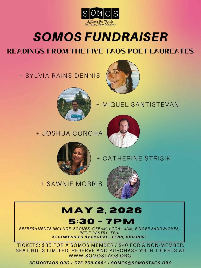 A SOMOS fundraiser will be held on Saturday, May 2nd, at 5:30PM, with a reading from each of the five Taos Poet Laureates: Sawnie Morris (2017-2018), Catherine Strisik (2019-2021), Joshua Concha (2022-2023), Miguel Santistevan (2024-2025), and Sylvia Rains Dennis (2026-2027), accompanied by refreshments (homemade scones, local jam, cream, tea, finger sandwiches, and petit pastries) and live music by violinist Rachael Penn.