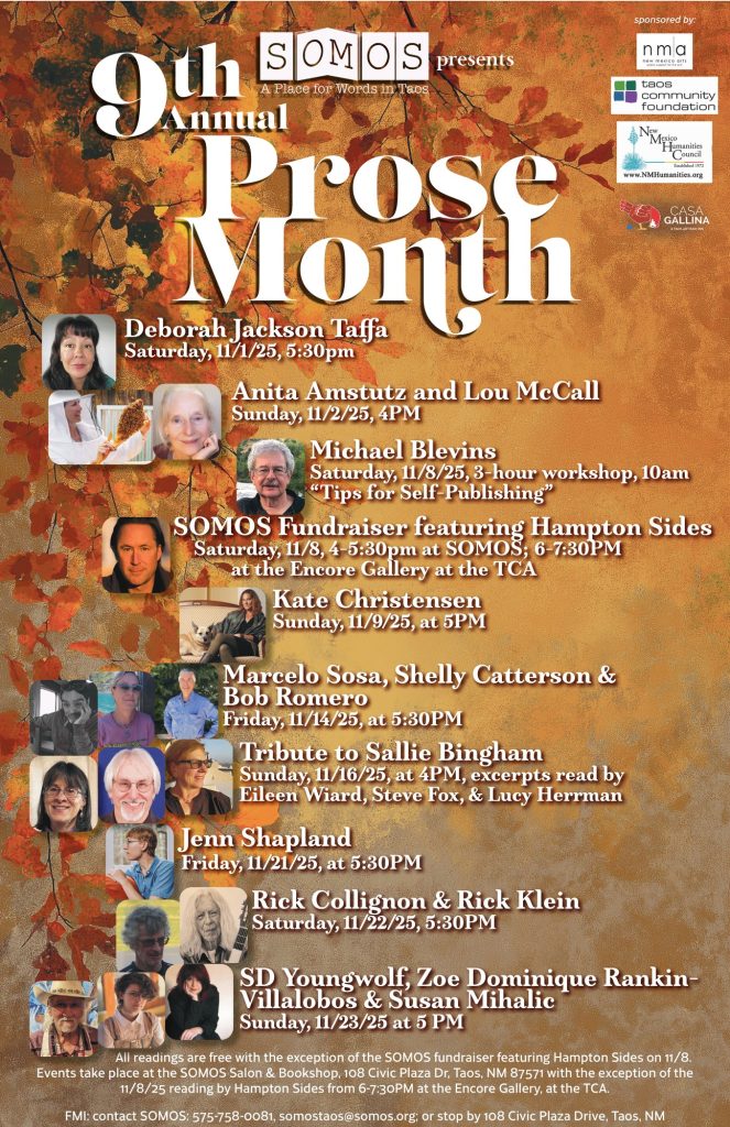* All readings are free with the exception of the SOMOS fundraiser featuring Hampton Sides on 11/8. Events take place at the SOMOS Salon and Bookshop, 108 Civic Plaza Dr, Taos, NM 87571 with the exception of the 11/8/25 reading by Hampton Sides from 6-7:30pm at the Encore Gallery at the TCA.
