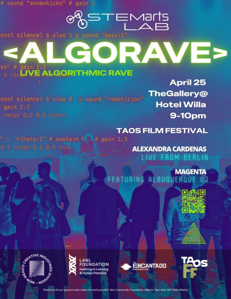 STEMarts Lab is bringing the first Algorave performance to New Mexico as part of the Taos Film Festival. Alexandra Cardenas will perform virtually from Berlin at the Hotel Willa on Saturday night April 25th from 9 to 10pm. Joining Alexandra in-person will be local VJ/ Artist MAGENTA.