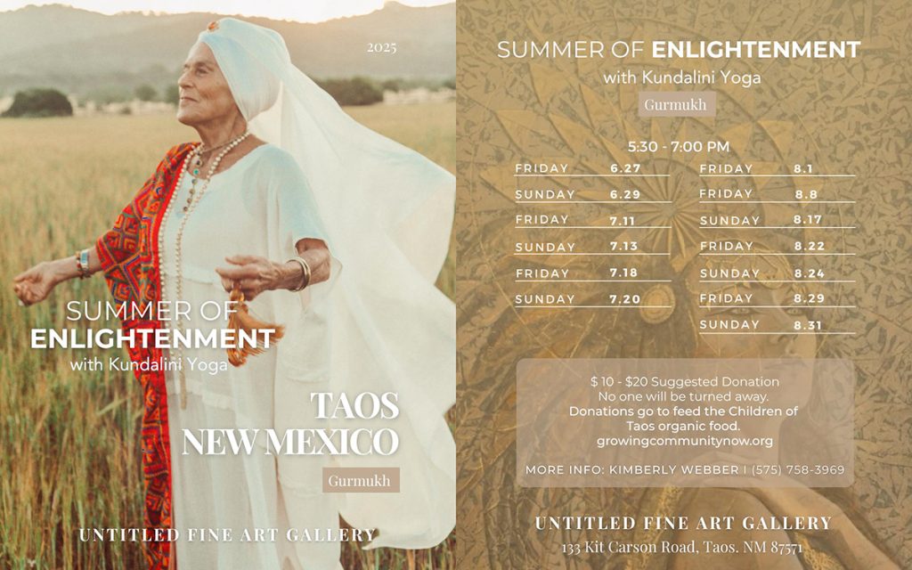 We are honored to host the legendary teacher Gurmukh at Untitled Fine Art this summer. You are invited to join us for kundalini yoga and meditation classes beginning on Friday June 27th through Sunday August 31st from 5:30 to 7:00 p.m. All classes are by donation with a suggested $10 to $20 offering. 100% of the money raised is gifted to feed local Taos area children organic, locally grown food. Growingcommunitynow.org prepares 800 to 1000 organic meals per day as well as organizing partnerships with local farmers to teach kids how to plant, grow and harvest organic food.
