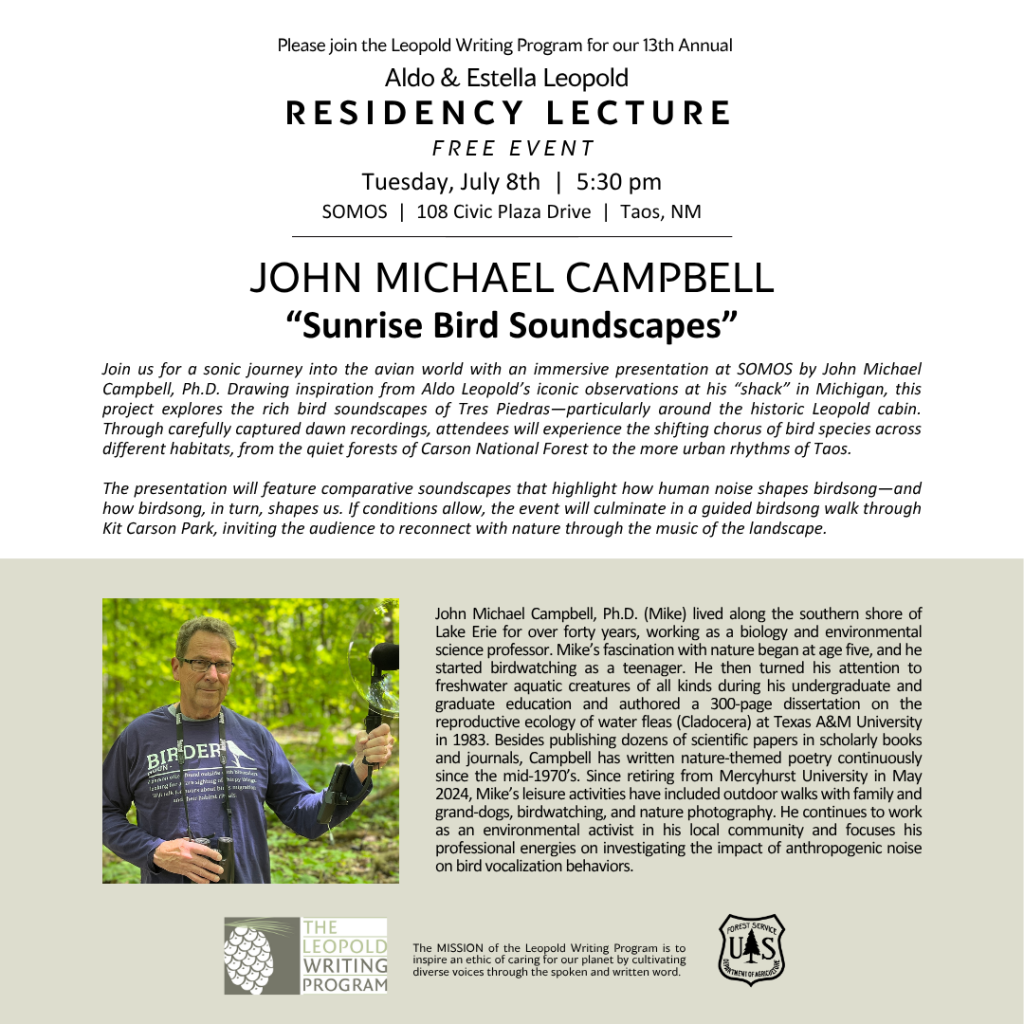 Join us for a sonic journey into the avian world with an immersive presentation at SOMOS by John Michael Campbell, Ph.D. Drawing inspiration from Aldo Leopold’s iconic observations at his “shack” in Michigan, this project explores the rich bird soundscapes of Tres Piedras—particularly around the historic Leopold cabin. Through carefully captured dawn recordings, attendees will experience the shifting chorus of bird species across different habitats, from the quiet forests of Carson National Forest to the more urban rhythms of Taos.