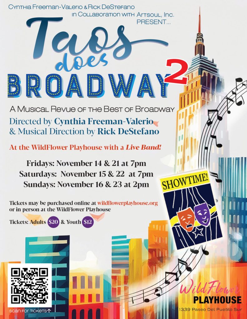 Cynthia Freeman-Valerio and Rick DeStefano in collaboration with Art Soul, Inc present Taos Does Broadway 2, a musical revue of the best of Broadway at WildFlower Playhouse with a live band. Fridays 11/14 & 11/21, Saturdays 11/15 & 11/22 at 7PM and Sundays 11/16 & 11/23 at 2PM. Tickets are $20 for adults, $12 for youth and can be purchased at wildflowerplayhouse.org.