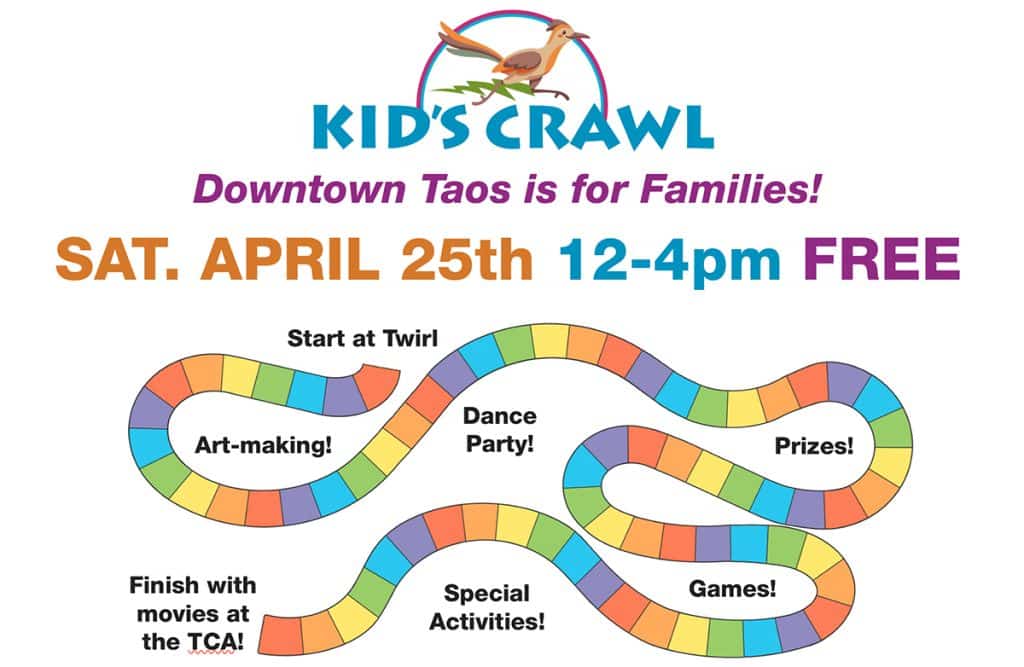 Get ready to explore downtown Taos like never before! Kids Crawl is a family-friendly adventure that invites you to wander from one activity to the next, collecting stamps, making art, discovering new places, and connecting with the heart of our community along the way. Participating locations include: Twirl (start here, make a passport!) – Taos MainStreet (party on the plaza!) – The Harwood Museum of Art – Imagine Children’s Museum – Taos Library – Chokolá – NWREC2 Child Find Event – Amina’s Children’s Boutique – Café Sagrado – Taos Rockers – Legacy Café – Taos Land Trust – Field Institute of Taos (games in Red Willow Park!) – Taos Center for the Arts ­- Taos Film Fest (end the day with a kid’s film fest at the TCA at 4pm)