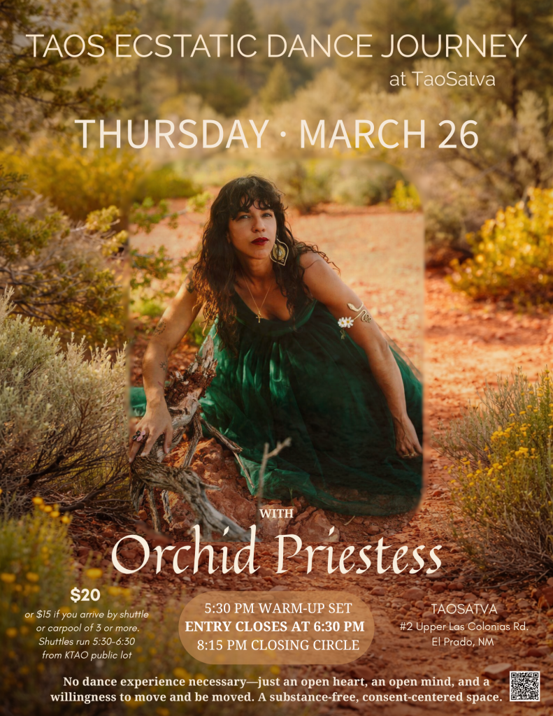 Local performer Orchid Priestess will be guiding the musical journey — she is only the 2nd Taos-based female DJ to grace the decks for our dance.