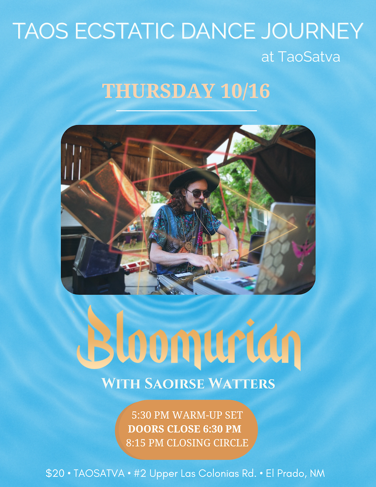 Join us Thursday, Oct 16 for Taos Ecstatic Dance Journey with Bloomurian and Saoirse Watters.