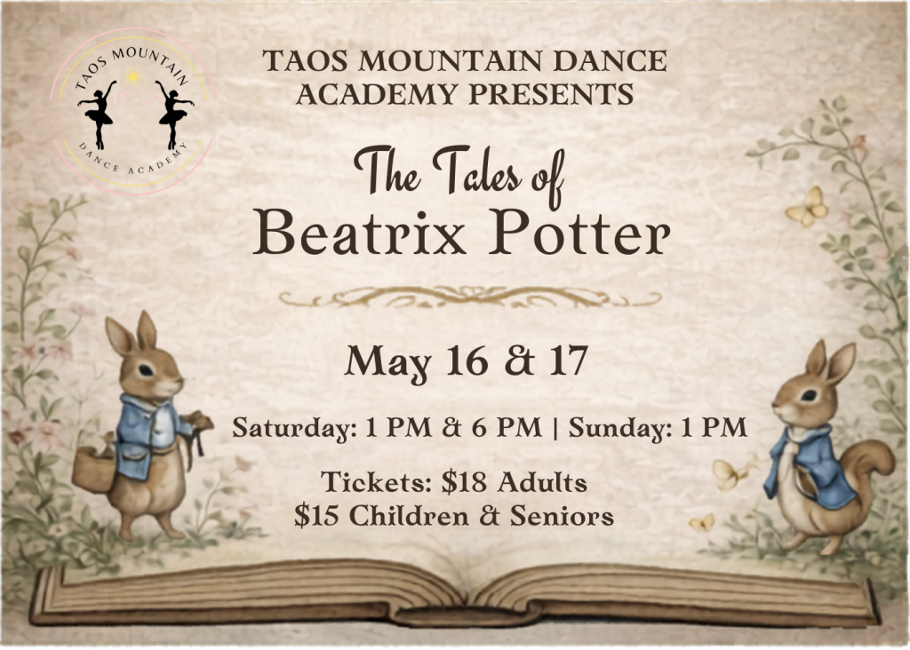 The Tales of Beatrix Potter is a family-friendly dance production presented by Taos Mountain Dance Academy, inspired by the timeless stories of Beatrix Potter. Through the art of dance, audiences will journey into a whimsical world of beloved storybook characters, where rabbits, woodland creatures, and garden scenes come to life on stage. The performance features dancers of multiple ages and levels, combining classical technique, storytelling, and imaginative choreography in an enchanting theatrical experience for all ages.