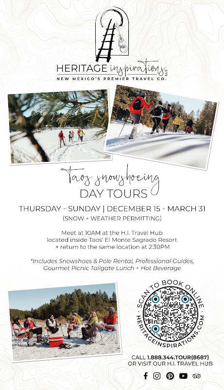 Your day begins at El Monte Sagrado Resort in Taos, where you’ll meet your expert Heritage Inspirations guide (we provide everything you need, including snowshoes and poles Outdoor Tailgating lunch prepared by Taos Local Manzanita Market. Enjoy lunch with Warm Blankets and Cozy Camp Chairs. Hot beverage provided in a camping mug & cold water.), You’ll caravan together on a scenic 20-minute drive up U.S. Highway 550 to Amole Canyon in the Carson National Forest