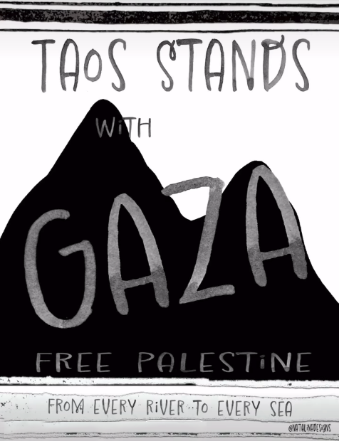Taos Stands with Gaza this Saturday, October 4th on the Global Day of Action. This action has been organized by individuals across generations, it begins at 11am on Paseo in front of the courthouse and Farmer’s Market. All are welcome.