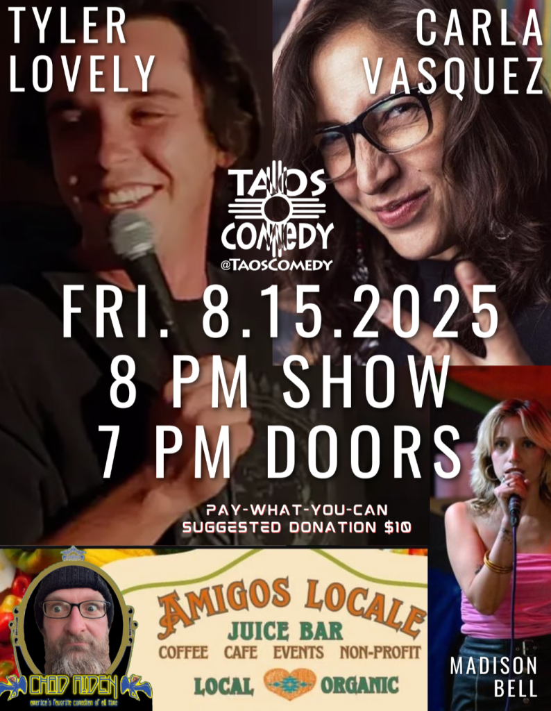 TaosComedy presents Tyler Lovely, Carla Vasquez, Madison Bell, Chad Riden at Amigos Locale 2025.8.15 $10 suggested donation.