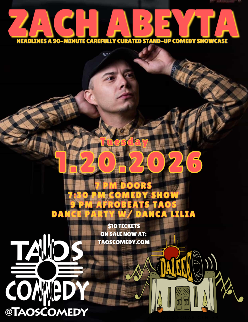 Winter Joy is a night of shared warmth in the coldest season: Zach Abeyta (multiple times voted the funniest man in New Mexico) headlines a live @TaosComedy show to lift your spirits, followed by a high-energy dance party from AfrobeatsTaos w/ Danca Lilia to keep you moving. Laugh, dance, and shake off the winter blues.